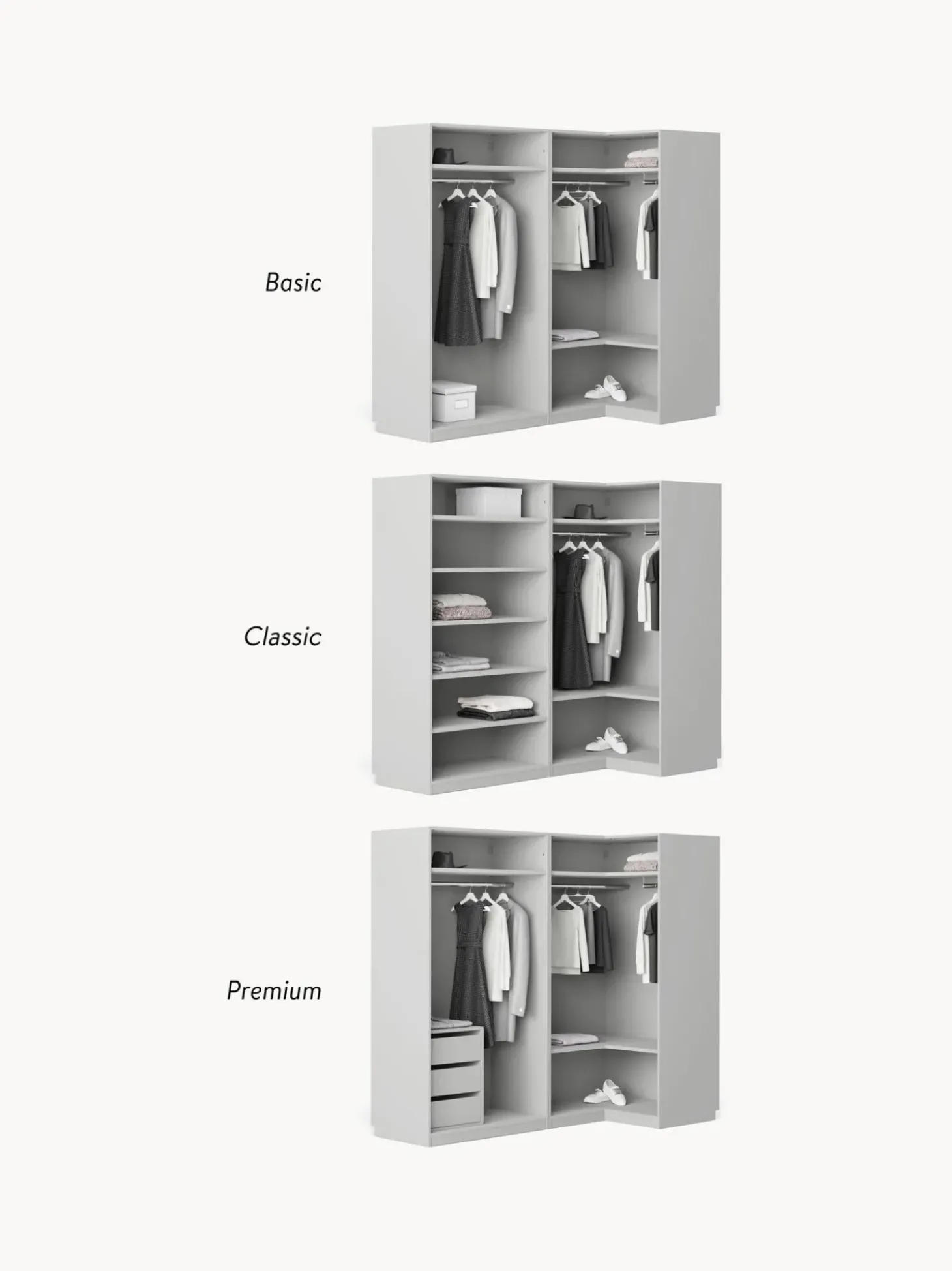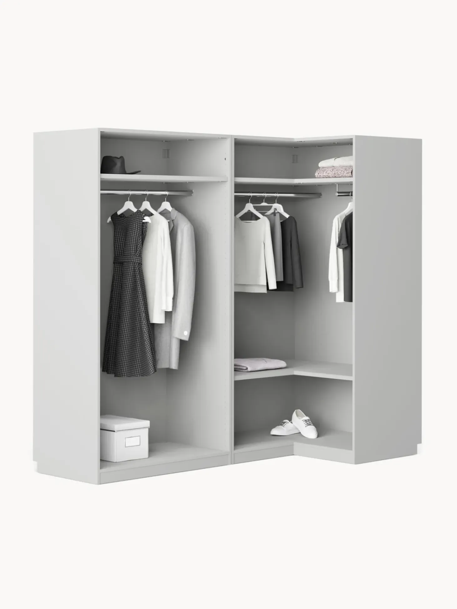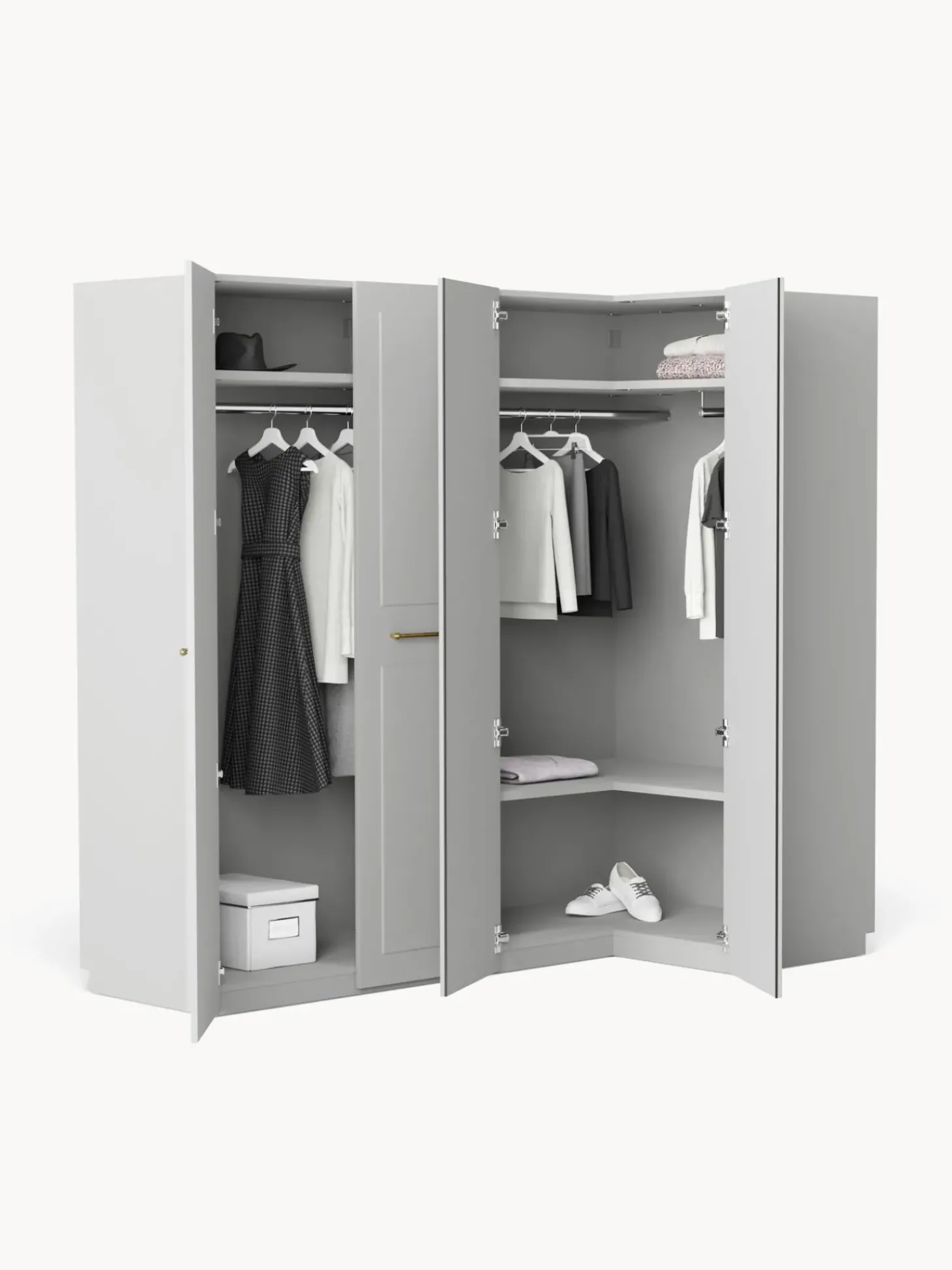 Molto Piu00F9 Di Un Normale Armadio: Il Nostro Modello Charlotte Dell’Esclusiva Westwing Collection U00E8 Un Vero E Proprio Tuttofare E Allo Stesso Tempo Un Grande Highlight Di Design. La Moderna Interpretazione Del Look Country Con Lo Speciale Aspetto 3D U00E8 Completata Dalle Maniglie In Ottone Con Finitura Anticata. Tuttavia, L’Armadio Non Convince Solo Per Il Suo Look Particolare, Ma Anche Per Gli Interni Spaziosi E La Modularitu00E0! Il Modello U00E8 Disponibile In Diversi Colori, In Tre Diverse Versioni Interne (Basic, Classic, Premium), In Diverse Larghezze E Altezze E Con Ante Scorrevoli O A Battente. Nessun Desiderio Rimane Insoddisfatto!Nn- Armadio Componibile Composto Da 1 Modulo Angolare E 1 Modulo Con Interno Basicn- Modulo Angolare Incl. 2 Aste Appendiabiti, 2 Ripianin- Modulo Con Interno Premium Con 1 Asta Appendiabiti, 1 Ripianin- Ante Girevoli Con Sistema Di Chiusura Soft-Closen- Aste E Ripiani Regolabili In Altezzan- Riduzione Del Lavoro Di Montaggio Grazie All’Assemblaggio Verticale E Agli Elementi Dell’Armadio Preassemblatin- Made In Eunnil Design Incontra La Funzionalitu00E0: Crea Il Tuo Armadio Charlotte Personalizzato Combinando I Singoli Moduli O Ampliando Quello Esistente. Tutti I Moduli Sono Disponibili Nella Nostra Gamma.Nnil Tuo Guardaroba Dovrebbe Essere Unico Come Il Tuo Stile! Ecco Perchu00E9 Il Nostro Armadio Charlotte U00E8 Disponibile In Tre Diverse Versioni Interne Per Soddisfare Tutte Le Esigenze:Nninterno Basic:N- Numero Di Aste Aappendiabiti: 1N- Numero Di Ripiani: 1N- Numero Di Cassetti: 0Nninterno Classic:N- Numero Di Aste Appendiabiti: 0N- Numero Di Ripiani: 5N- Numero Di Cassetti: 0Nninterno Premium: N- Numero Di Aste Appendiabiti: 1N- Numero Di Ripiani: 1N- Numero Di Cassetti: 3