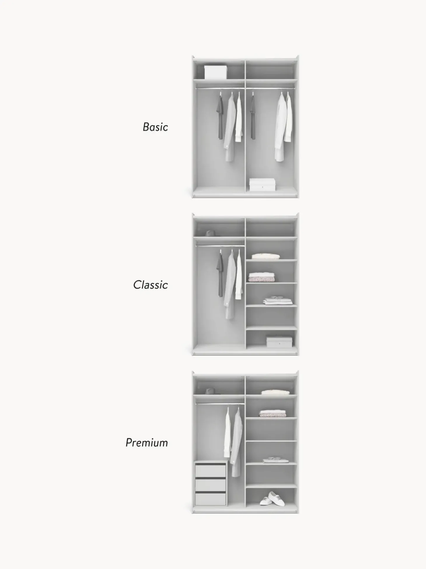 Molto Piu00F9 Di Un Normale Guardaroba: Il Nostro Nuovo Modello Charlotte Dell’Esclusiva Collezione Westwing U00E8 Un Vero E Proprio Tuttofare E Allo Stesso Tempo Un Grande Highlight Di Design. L’Interpretazione Moderna Del Look Country Con Il Particolare Aspetto 3D U00E8 Completata Dalle Maniglie In Ottone Con Finitura Anticata. Tuttavia, L’Armadio Non Convince Solo Per Il Suo Look Particolare, Ma Anche Per I Suoi Interni Spaziosi E La Sua Modularitu00E0! Il Modello U00E8 Disponibile In Diversi Colori, Con Tre Diversi Interni (Basic, Classic, Premium) E In Diverse Larghezze E Altezze E Con Ante Scorrevoli O Girevoli. Qui Non Ci Sono Piu00F9 Desideri!Nn- Armadio Componibile Composto Da 2 Moduli Con Interni Premium: Incl. 1 Asta Appendiabiti, 8 Ripiani, 3 Cassettin- Ante Scorrevolin- Aste Appendiabiti E Ripiani Regolabili In Altezzan- Cassettiera Preassemblata E Posizionabile Singolarmenten- La Struttura Verticale E Gli Elementi Del Guardaroba Preassemblati Consentono Di Ridurre Il Lavoro Di Montaggion- Made In Eunnil Design Incontra La Funzionalitu00E0. Create Il Vostro Guardaroba Charlotte Personalizzato Combinando I Singoli Moduli O Ampliando Il Guardaroba Charlotte Esistente. Nella Nostra Gamma Troverete Tutti I Moduli Charlotte.Nnil Vostro Guardaroba Dovrebbe Essere Unico Come Il Vostro Stile! Il Nostro Armadio Charlotte Vi Offre Tre Diversi Interni Tra Cui Scegliere Per Soddisfare Le Vostre Esigenze Individuali: Nninterni Basic:N- Numero Di Aste Appendiabiti: 2N- Numero Di Ripiani: 4N- Numero Di Cassetti: 0Nninterni Classic:N- Numero Di Aste Appendiabiti: 1N- Numero Di Ripiani: 8N- Numero Di Cassetti: 0Nninterni Premium: N- Numero Di Aste Appendiabiti: 1N- Numero Di Ripiani: 8N- Numero Di Cassetti: 3
