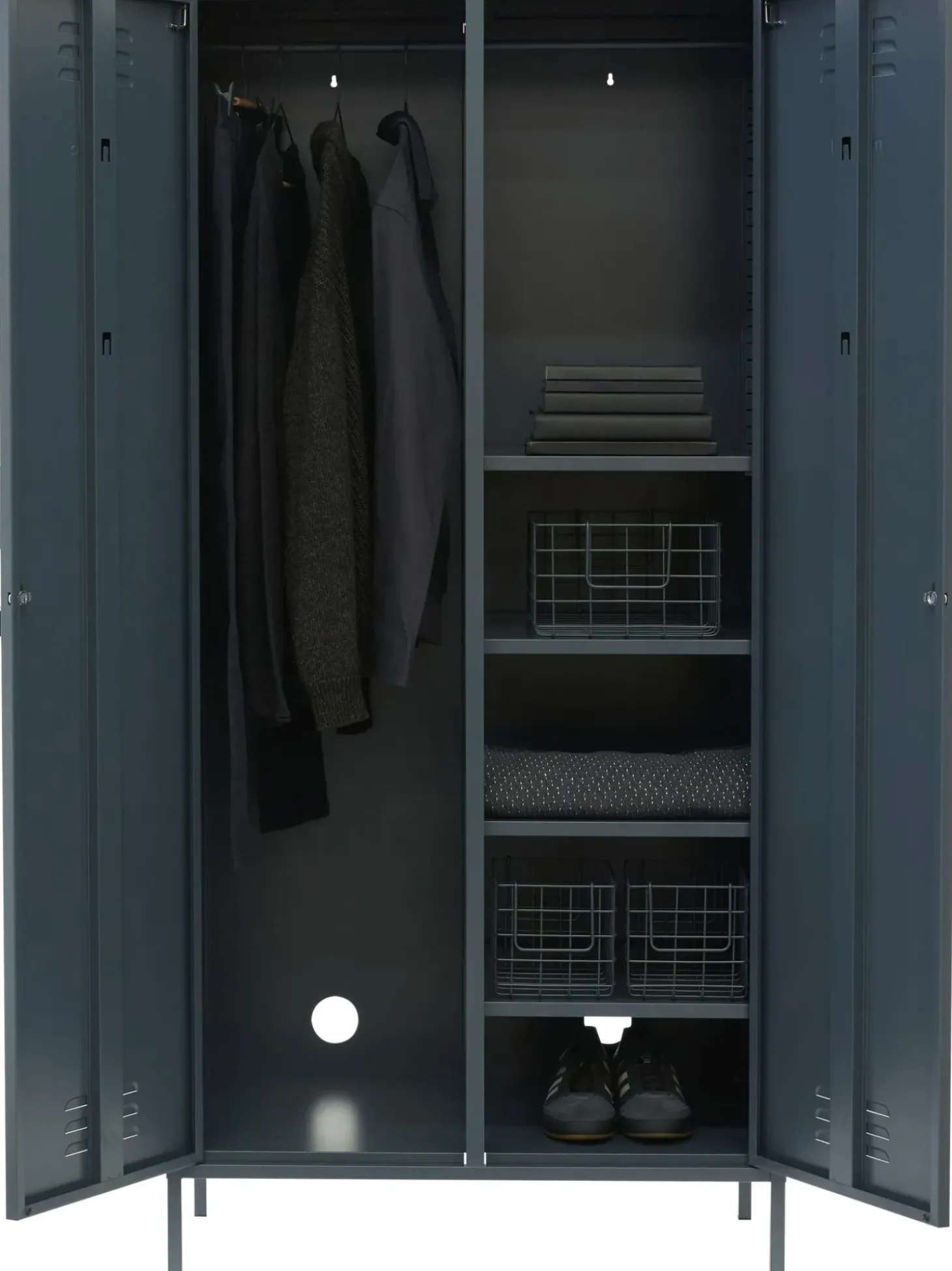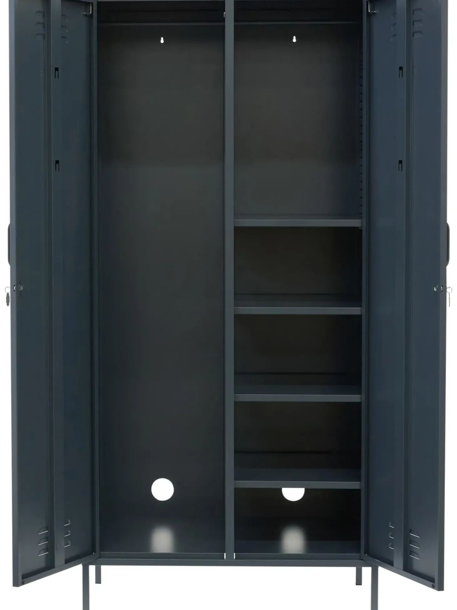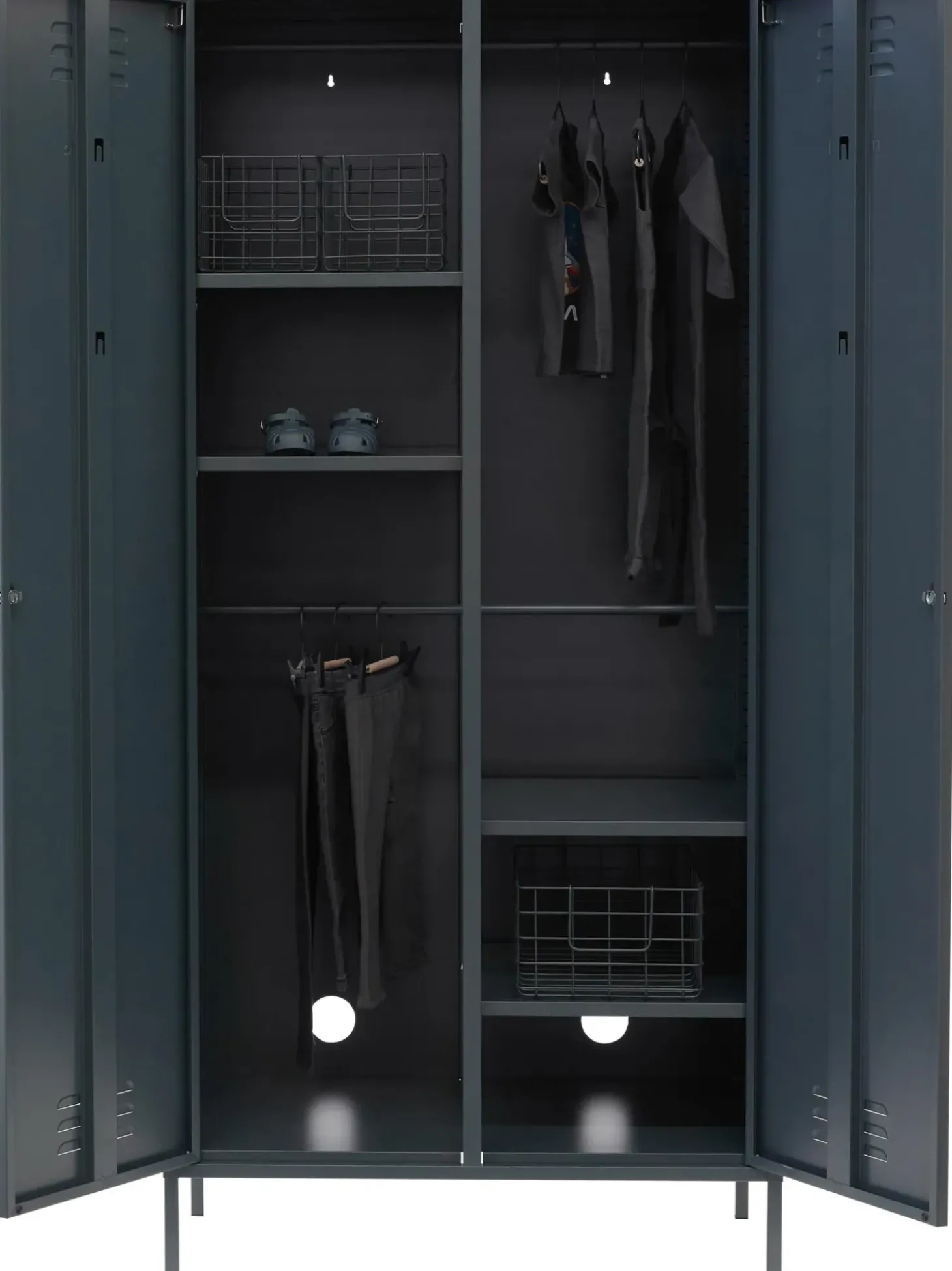 L’Armadio U00E8 Dotato Di Due Bastoni Appendiabiti E Quattro Ripiani Regolabili In Altezza.